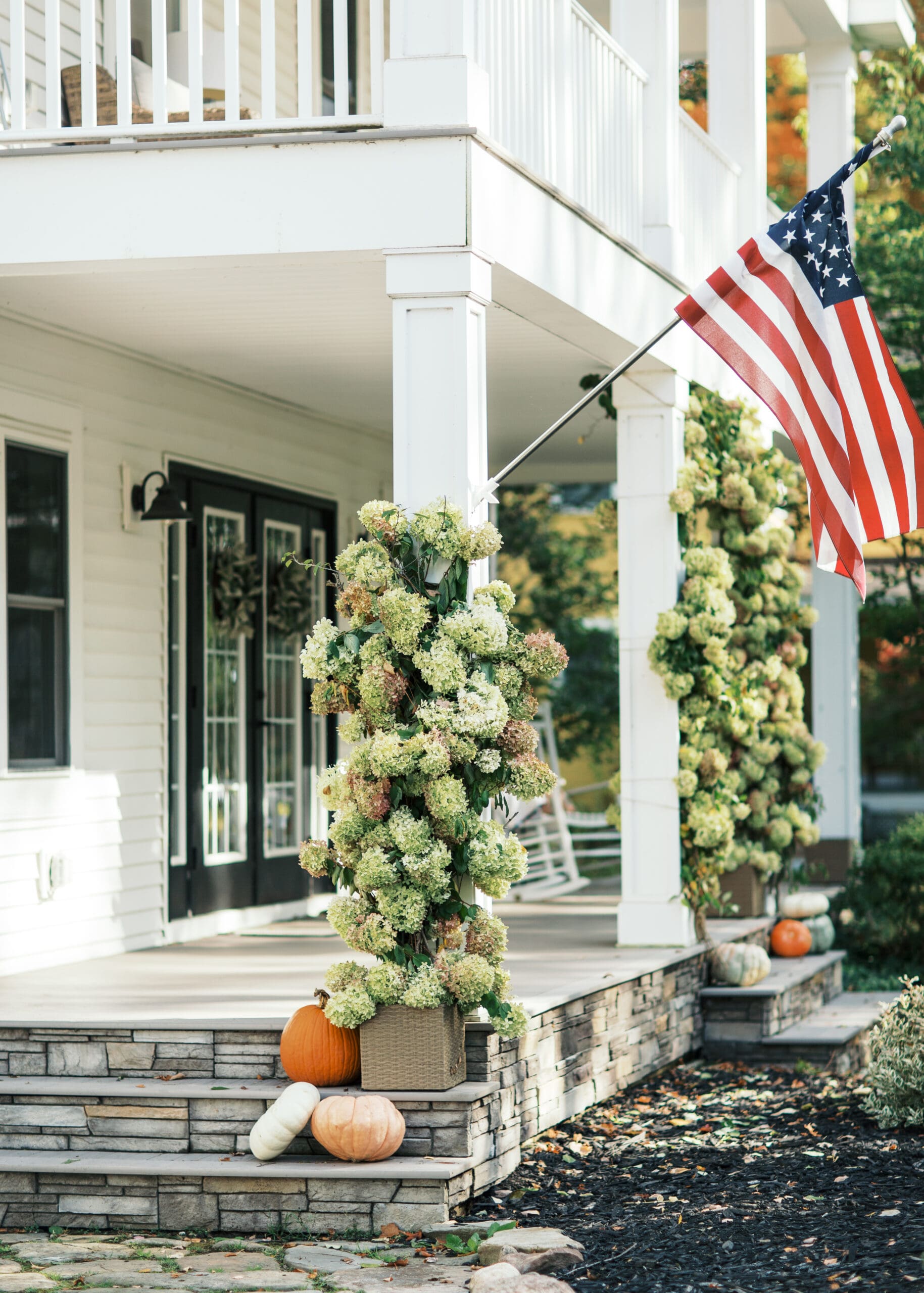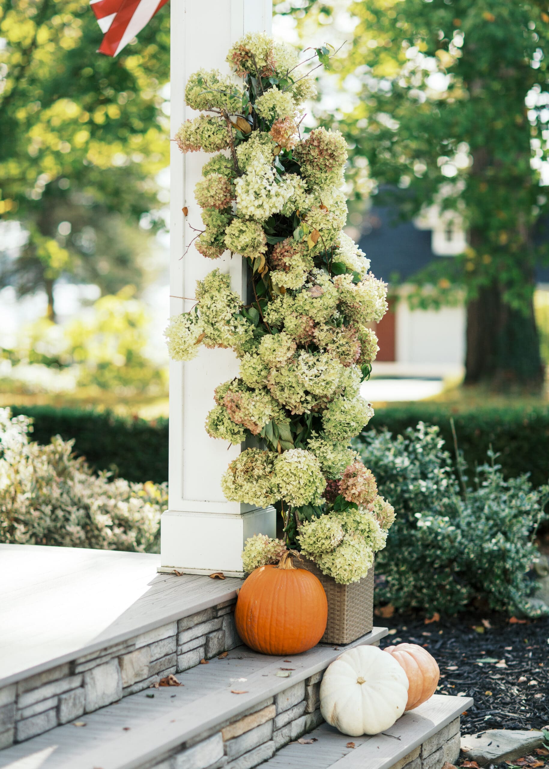 I knew I wanted to use the blooms for something special. As I was brainstorming ideas, an Autumn Porch Installation came to mind. I’ve never created anything like this before, so figuring out the logistics was definitely a challenge at first. There are some things I will do differently in future installations, like removing the planter and using white twine for a more discreet support system, but for the most part I am very proud of this installation! I still have 1 pillar to go, but we’re having a rainy week (thank you, Lord!) so I’ll need to wait for some dry weather again to tackle the final part of our installation.