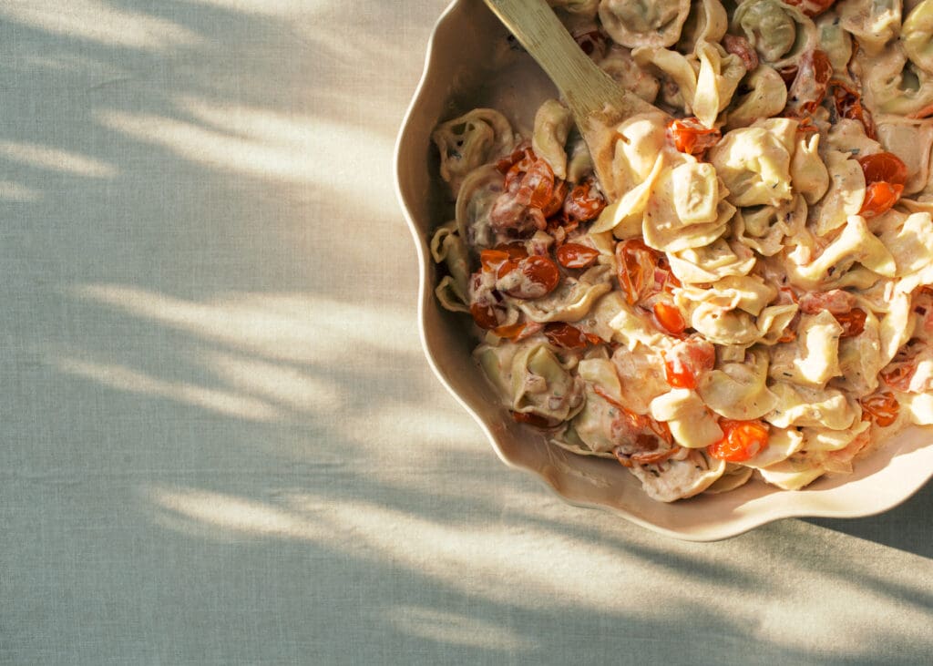 Growing up our family ate a lot of pasta. So naturally I’m drawn towards creating new pasta dishes for my own family. Looking for options that have clean(ish) ingredients, minimal ingredients for ease, and art equal parts simple to cook and tasty to eat can be…well, challenging. This Creamy Tomato & Mushroom Tortellini only requires 5 ingredients (check), only takes 30 minutes to make (check), isn’t terrible when it comes to quality ingredients (check), AND is so super tasty (check). In less words, it’s a complete winner.